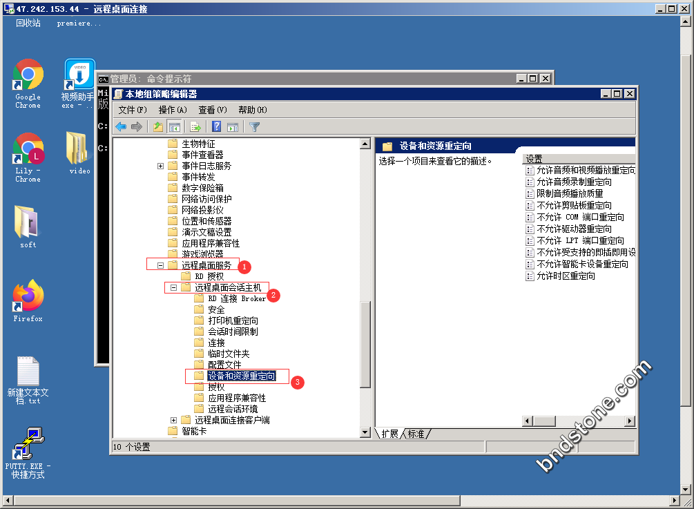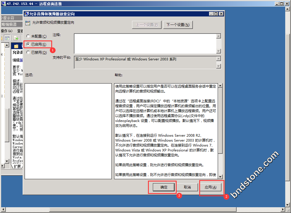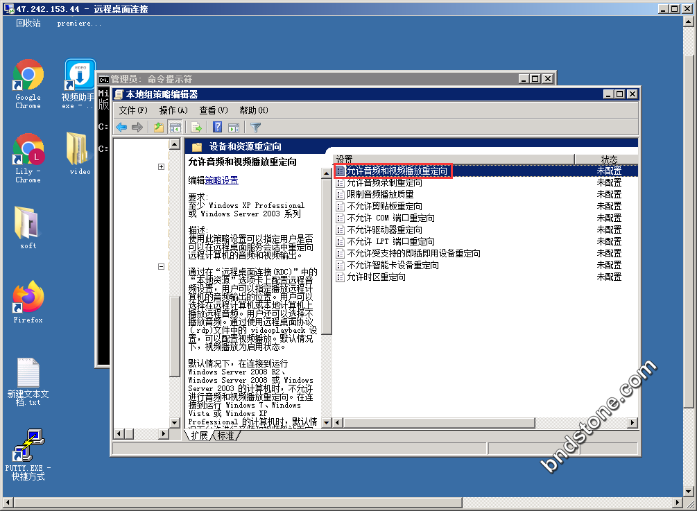 【计算机配置】-【管理模板】-【windows组件】-【远程桌面服务】-【远程桌面会话主机】-【设备和资源重定向】-【允许音频和视频播放重定向-设置为“已启动”】