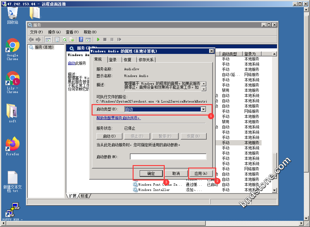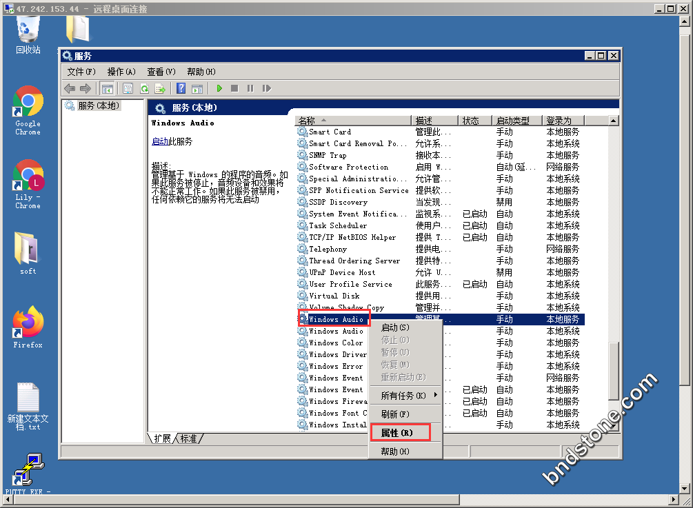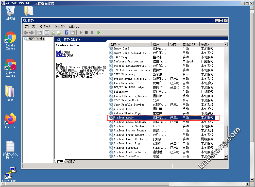 将windows audio,设置为自动,具体操作:右键-属性-启动类型:自动。