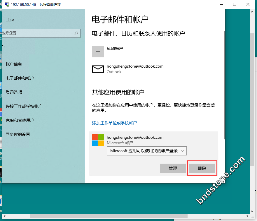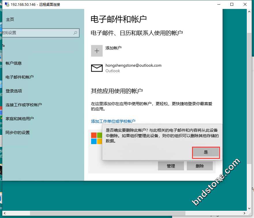 8. 【开始】-【设置】-【账户】-【电子邮件和邮户】-【删除】-【是】