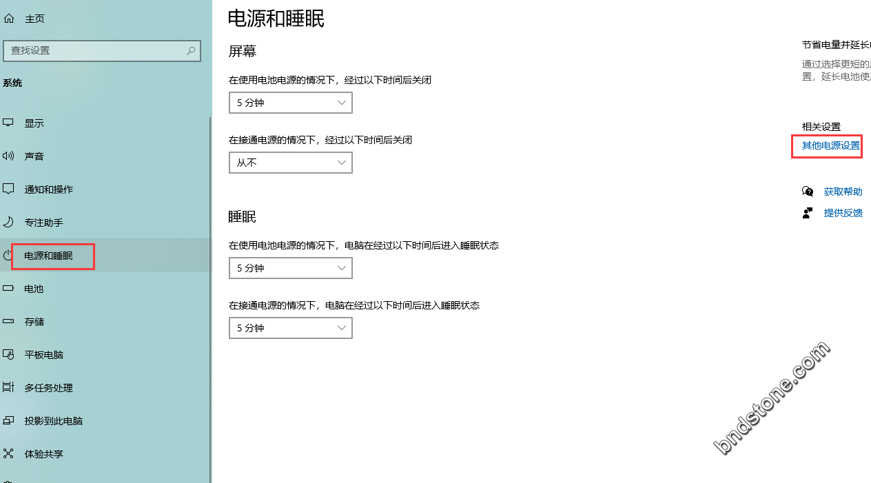 win10系统打开【开始】-【设置】-【系统】-【电源和睡眠】-【其他电源设置】