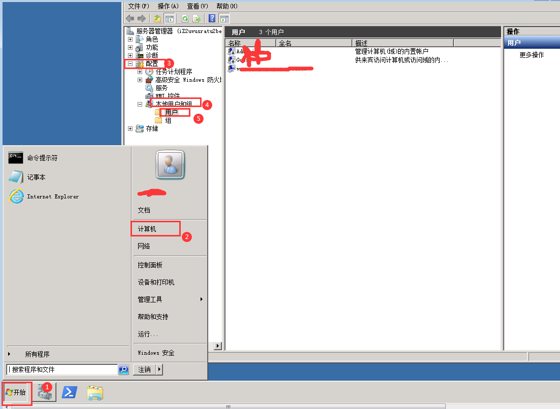 4. 开始 – 计算机[右键] – 管理 – 配置 – 本地用户和组 – 用户