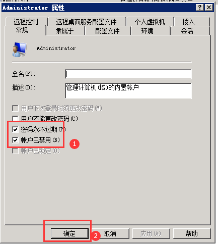4-1. 常规 – 密码永不过期 [打勾] – 账号已禁用 [打勾]