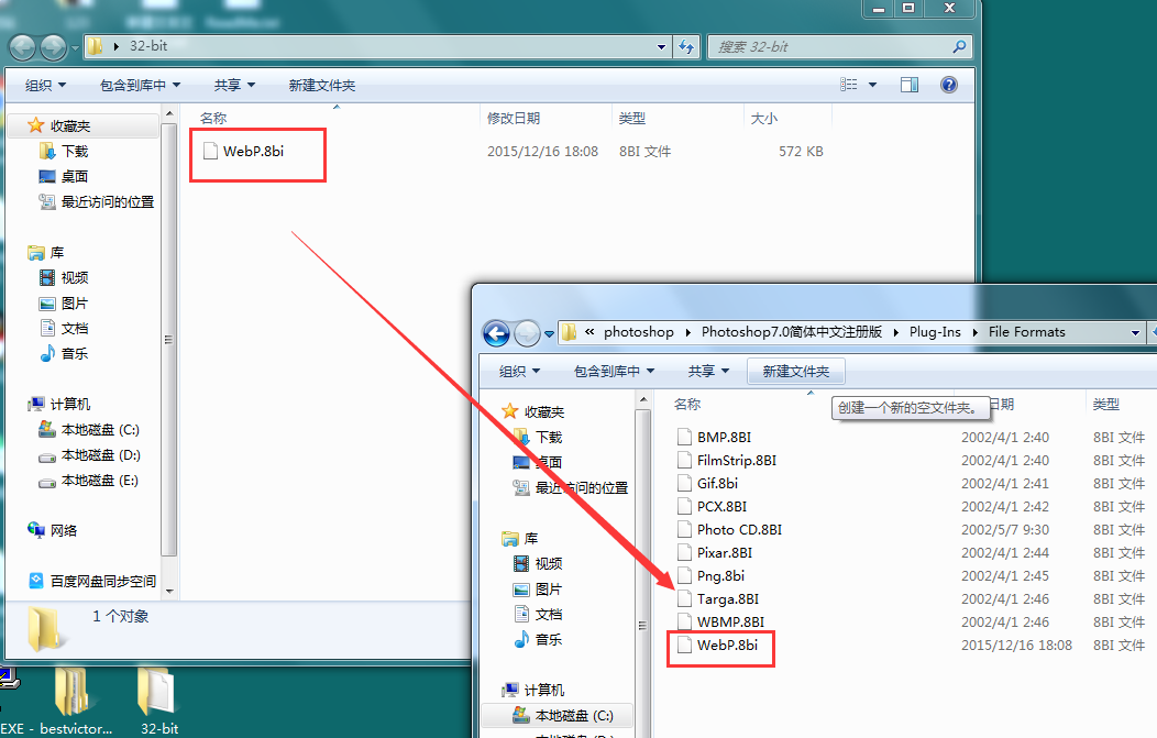 2、把 WebP.8bi 复制到photoshop安装目录的Plug-ins文件夹里面,这里面要注意区分你的PS是什么版本的,分32与64位版本。