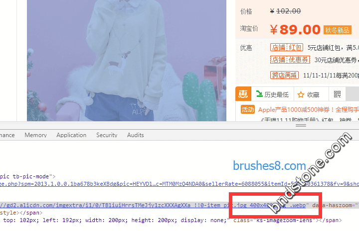 如下图所示,画红框框的地方其实是一个缩率图图片裁剪链接,但最后的图片格式你们也看到了是webp格式。我大致的浏览了下并不是所有的宝贝里面的图片都被启用了webp格式的缩略图。但已经是有相当一部分已经开始部署了。淘宝使用这么前沿的技术那么说明webp格式确实能帮助淘宝节省非常客观的网络流量。