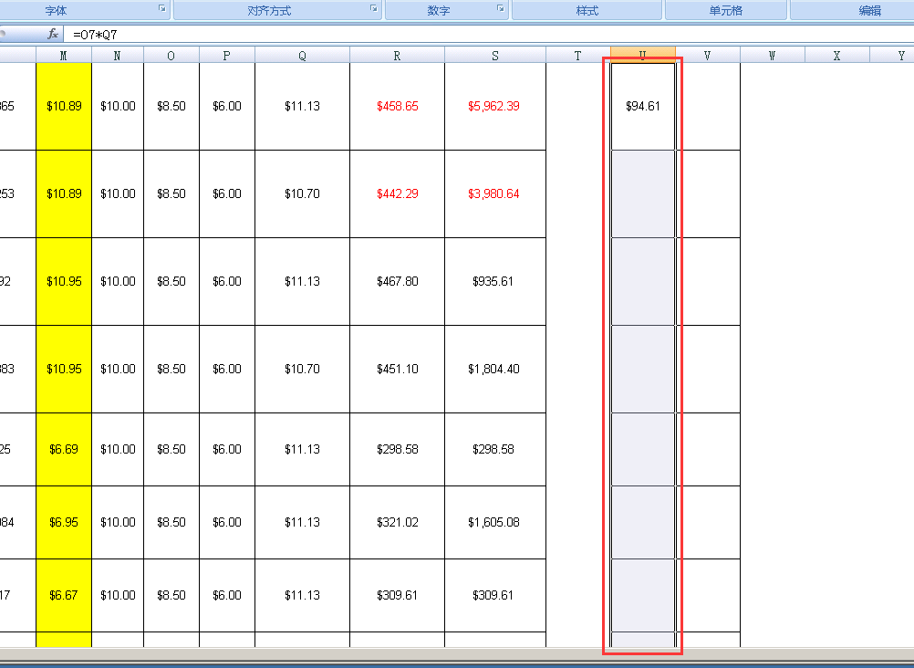 第三步: 鼠标左键放在填写栏,键盘同时按下 [Ctrl] + [Enter] 键.U列所有空格都会自动计算出来.