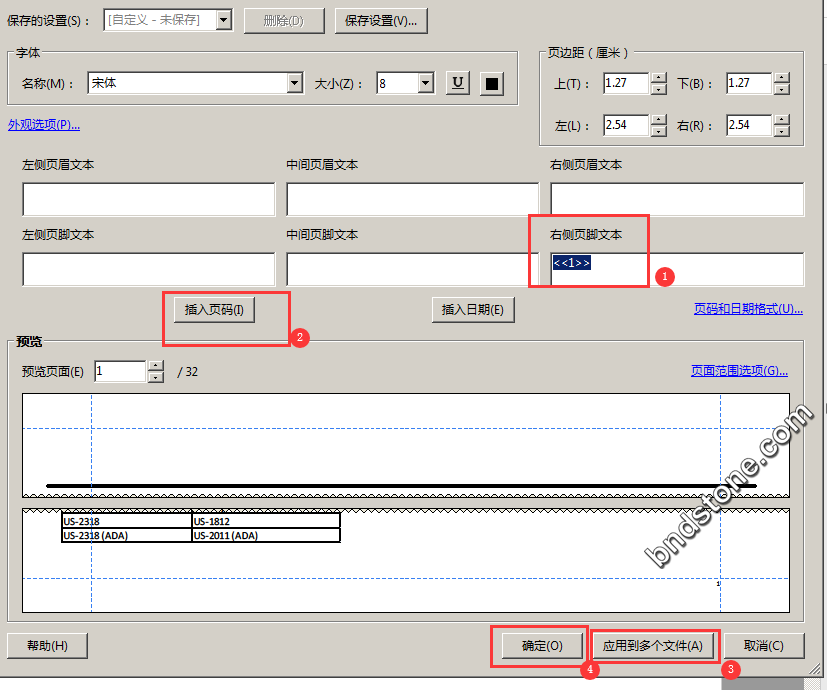 7-2. [页眉和页脚] – [添加]- [右侧页脚]-[插入页码]-[应用到多个页面]-[确定]