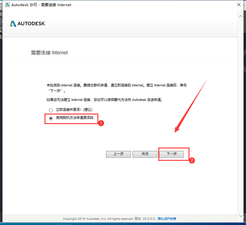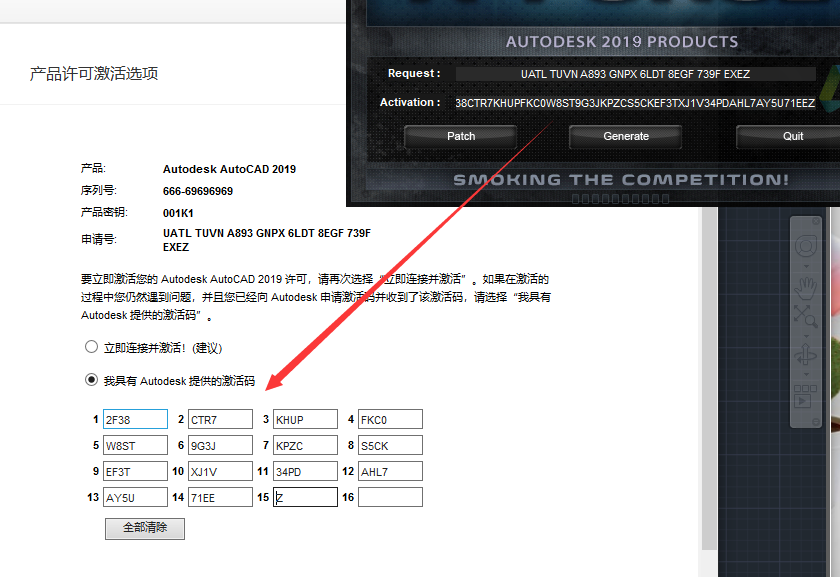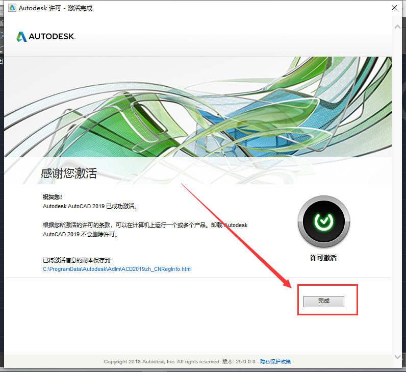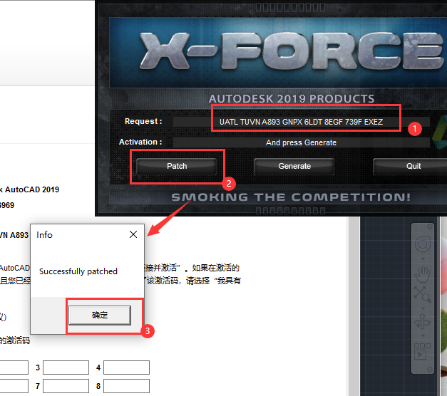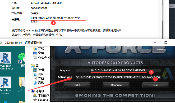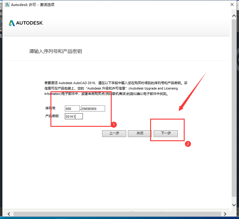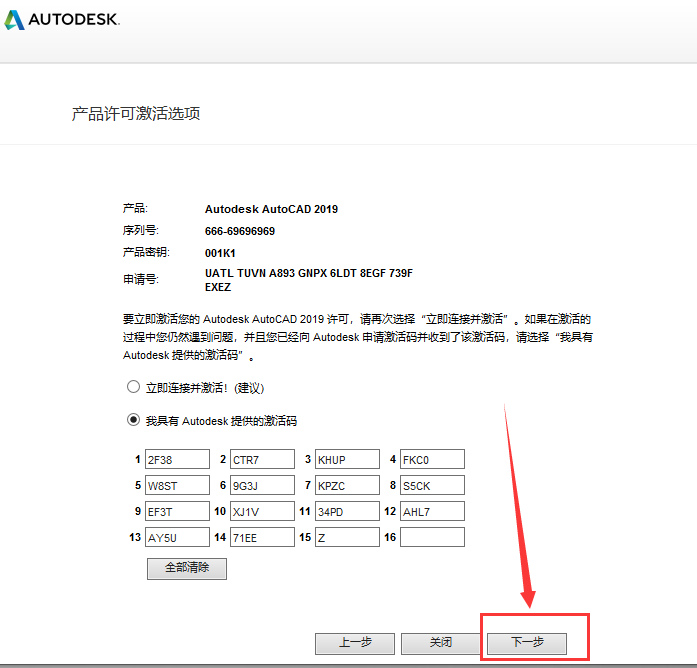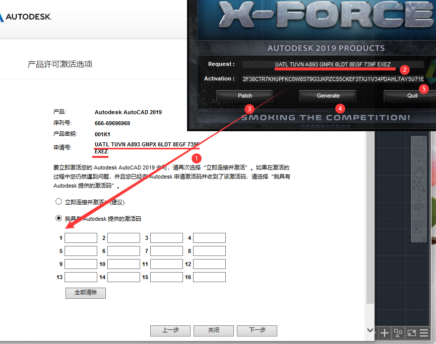 1 2 3 4 5 6 7 | 点击【我同意】后弹出如下界面,点击【激活】。 序列号可输入:666-69696969、667-98989898、400-45454545、066-66666666等。产品秘钥:001K1,点击“下一步”。 这里选择【我具有Autodesk提供的激活码】并以管理员身份运行注册机,将申请号复制到 Request 栏中,先点击Patch按钮,弹出 Success 窗口后再点击Generate按钮生成序列号,并将序列号复制到 AutoCAD 的激活窗口中,然后点击“下一步”。 稍等片刻,激活成功。 |